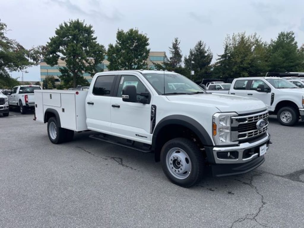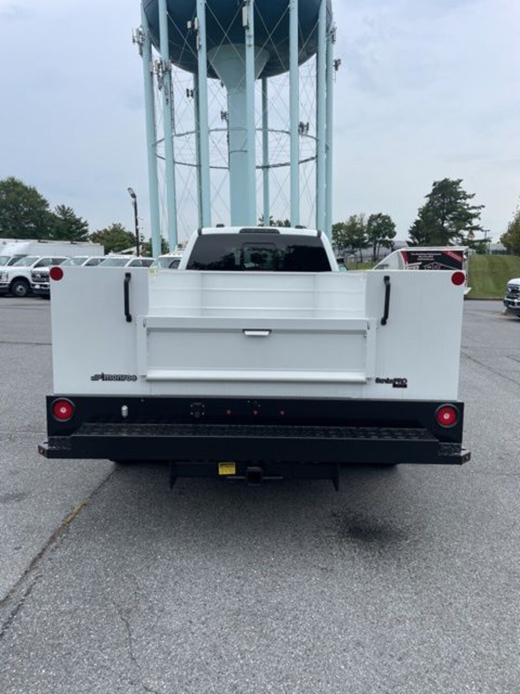 2025 Ford F-450SD Oxford White 4D Crew Cab/Chassis XL W4H 4WD 10-Speed Automatic Power Stroke 6.7L V8 DI 32V OHV Turbodiesel, Upfitted with 9' ServicePro open utility body.
