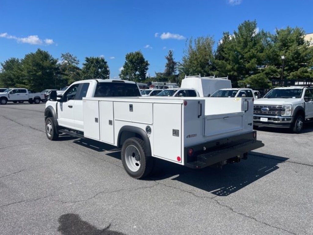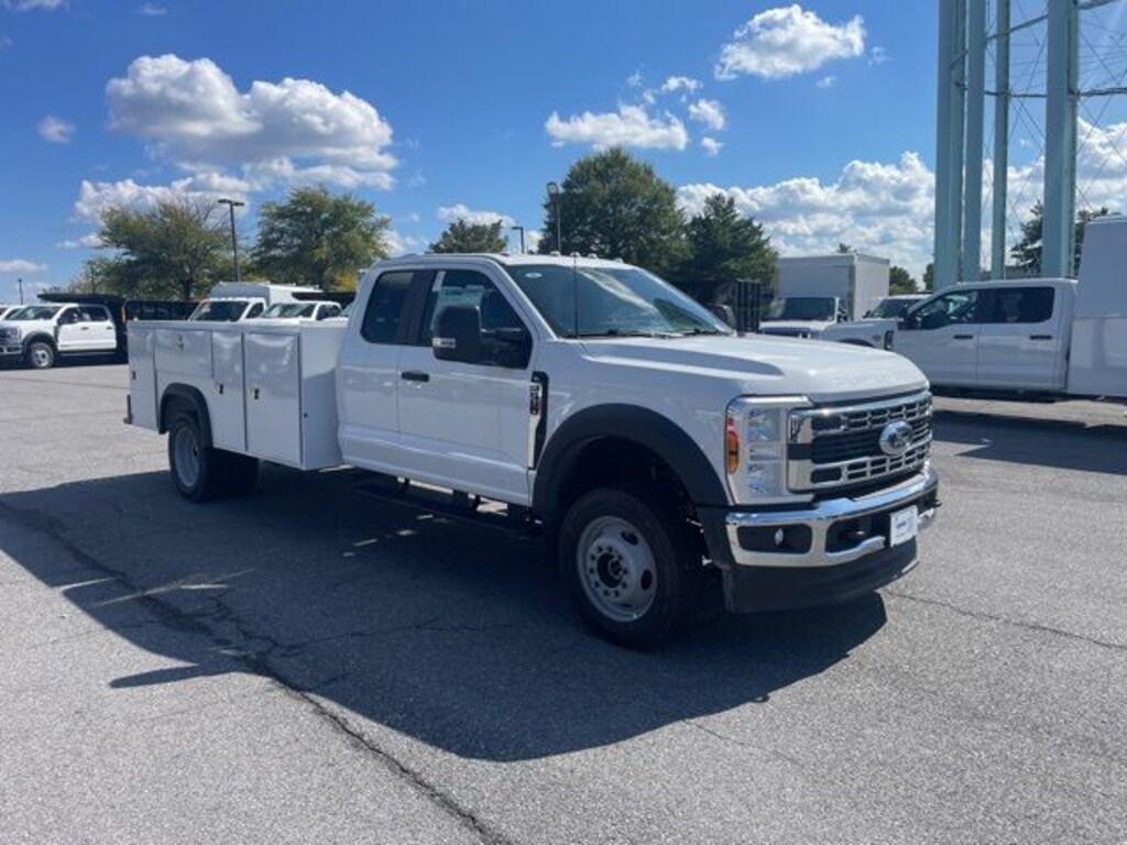 2025 Ford F-550SD Oxford White Super Cab XL X5H 4WD 10-Speed Automatic 7.3L V8 PFI OHV 16V Federal 335hp. Upfitted with 11' Service Pro open utilty body.