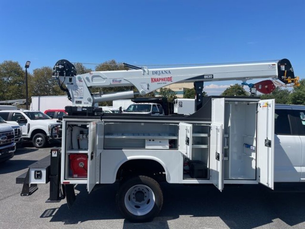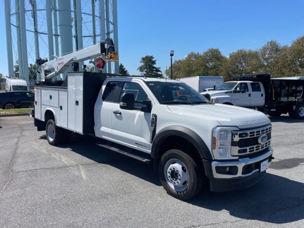 2025 Ford F-550SD Oxford White Super Cab XL X5H 4WD 10-Speed Automatic Power Stroke 6.7L V8 DI 32V OHV Turbodiesel, Upfitted with Knapheide KMT1-11 11' Crane Body, Stellar 8630 7500lb crane, 30' reach, Boss 40cfm, Hyd driven air compressor, 4,000 watt inverter, master locking cabinets.
