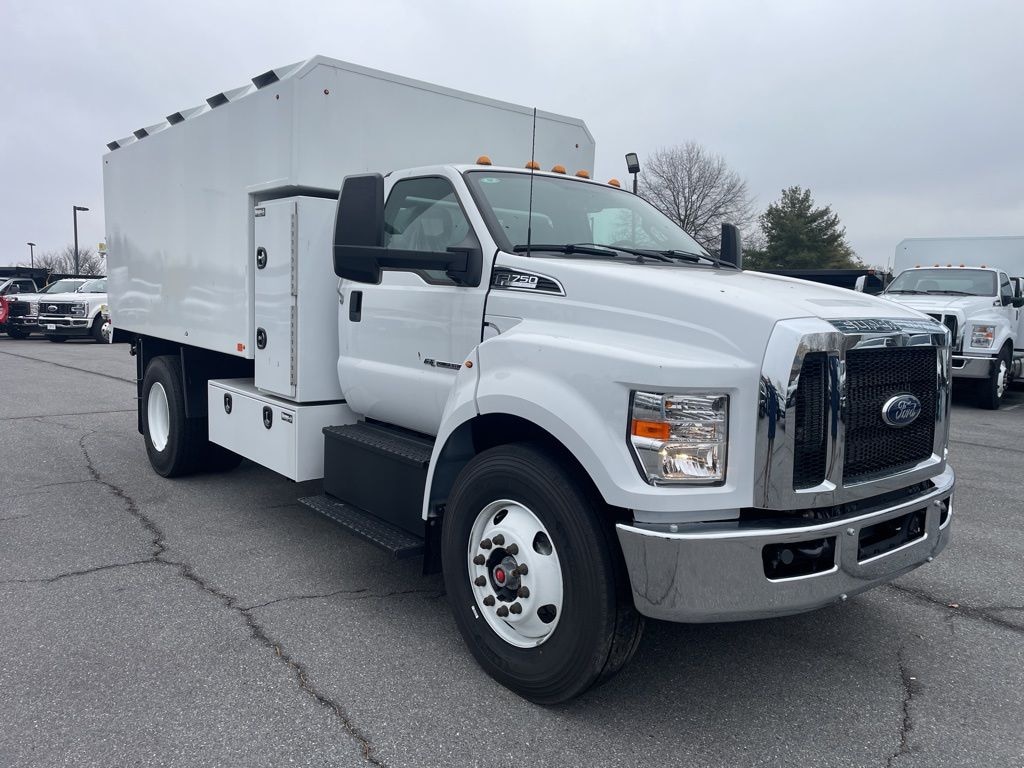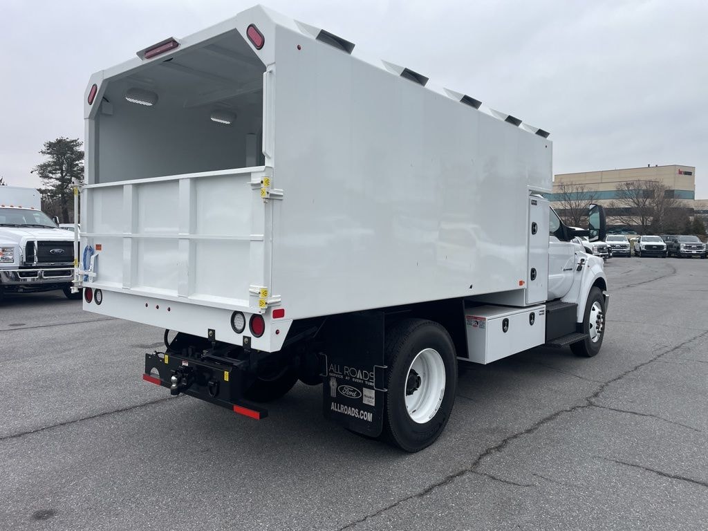 2025 Ford F-750SD Oxford White DRW RWD 10-Speed Automatic, 6.7L Diesel engine with PJ's Chipper Box Dump and back pack toolboxes.